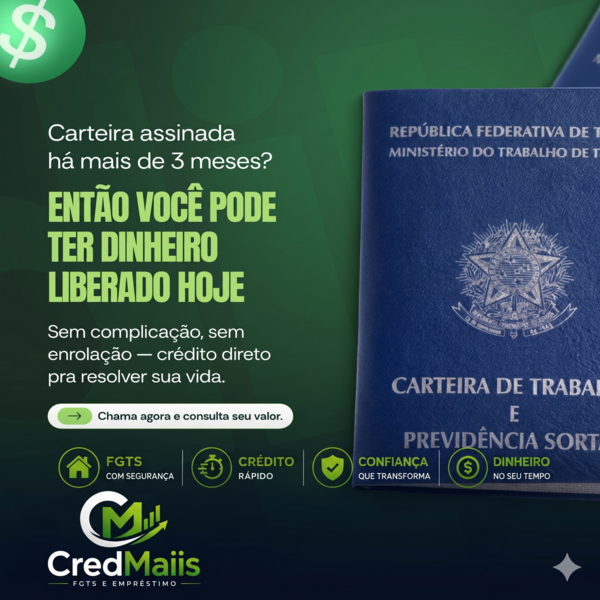 A CredMaiis é uma empresa brasileira focada em facilitar o acesso ao crédito de maneira simples, rápida e confiável. Especializada na antecipação do FGTS e na oferta de empréstimos, a empresa atua com transparência e compromisso, conectando clientes às melhores soluções financeiras do mercado. Nosso objetivo é descomplicar processos, reduzir burocracias e garantir que cada cliente tenha acesso ao dinheiro que precisa no momento certo. Com atendimento ágil e personalizado, a CredMaiis trabalha para transformar necessidades em soluções, sempre com segurança, confiança e responsabilidade.