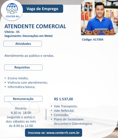 Remuneração: rR$ 1.537,00+ variável + vale transporte + vale refeição + plano de saúde (sem desconto) + plano odontológico + seguro