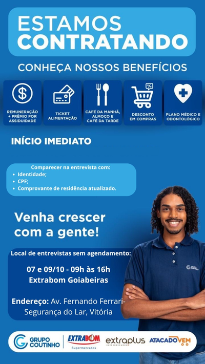 Local de entrevistas sem agendamento: 07 e 09/10 - 09h às 16h Extrabom Goiabeiras Endereço: Av. Fernando Ferrari- Segurança do Lar, Vitória