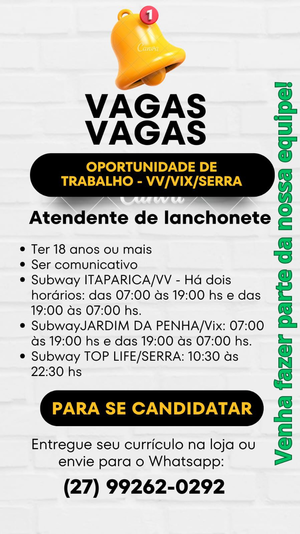 Subway JARDIM DA PENHA/Vix: 07:00 às 19:00 hs e das 19:00 às 07:00 hs