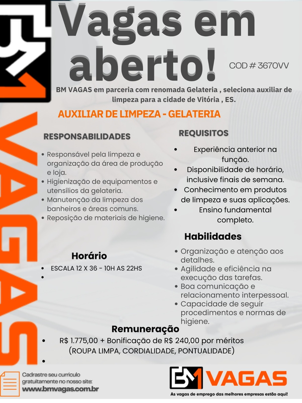 BM VAGAS em parceria com renomada Gelateria, seleciona auxiliar de limpeza para a cidade de Vitória, ES.
