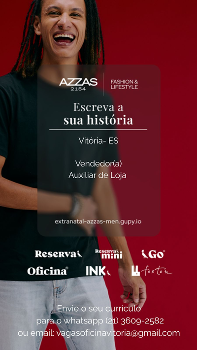 Benefícios: Comissão nas vendas online, Vale transporte, Vale refeição, Gympass, Sessões de telepsicoterapia, Plano de carreira, Premiações em loja, Desconto nas marcas, Parceria em universidades e cursos de idioma, Licença paternidade, Licença maternidade, plano de saúde e odontológico.