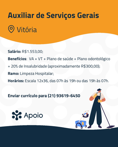 Benefícios: VA + VT + Plano de saúde + Plano odontológico + 20% de Insalubridade (aproximadamente R$ 300,00)