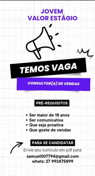 Estamos contratando, CONSULTOR(a) DE VENDAS.