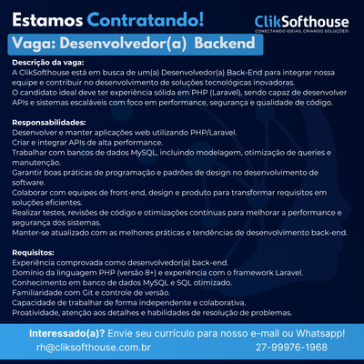 A ClikSofthouse está em busca de um(a) Desenvolvedor(a) Back-End para integrar nossa
