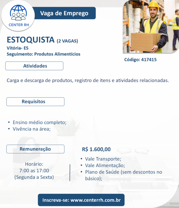 EMPRESA DE VITÓRIA CONTRATA PROFISSIONAL DE ESTOQUE: