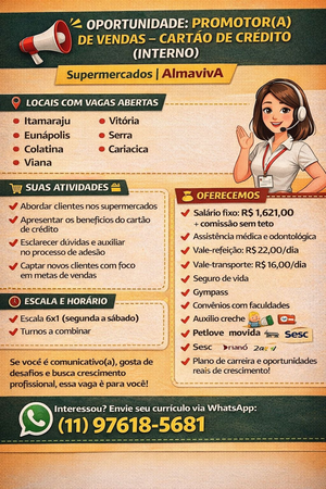 OPORTUNIDADE: PROMOTOR(A) DE VENDAS - CARTÃO DE CRÉDITO (INTERNO)