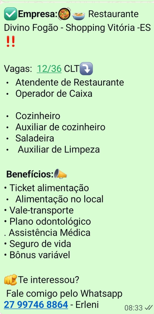 Exibir dicasCuidado com ofertas de emprego que solicitam o pagamento de taxa, exame admissional ou compra de certificados de cursos.