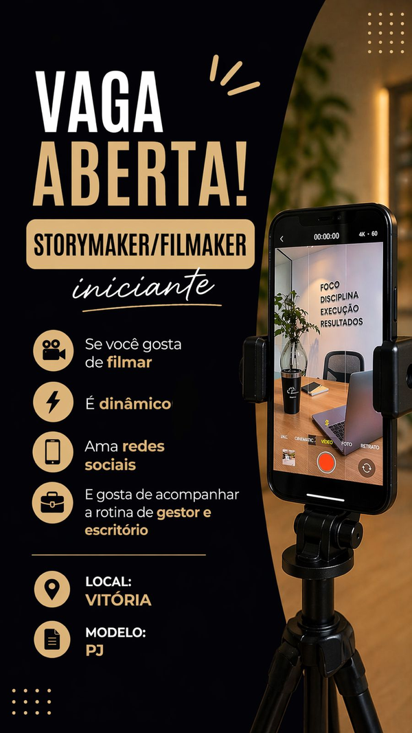 Estamos buscando um Storymaker para acompanhar de perto a rotina do gestor, registrando momentos reais e transformando o dia a dia em conteúdo estratégico.
