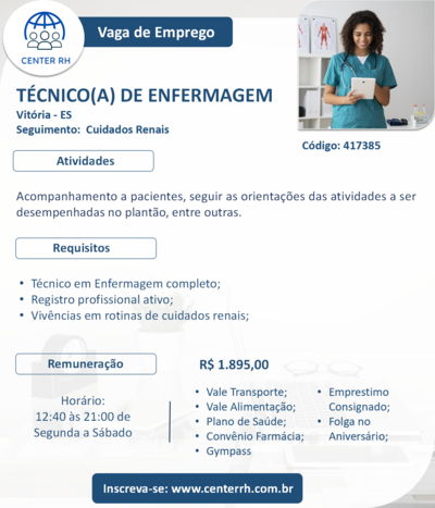 CLINICA MÉDICA LOCALIZADA EM VITÓRIA CONTRATA PARA ATUAR DE SEGUNDA A SÁBADO NO HORÁRIO DAS 12:40 às 21:00 HS.