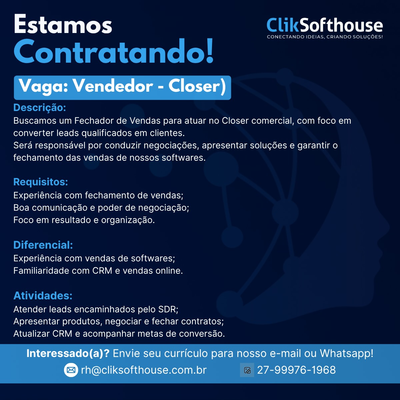 Buscamos um Fechador de Vendas para atuar no Closer comercial, com foco em
