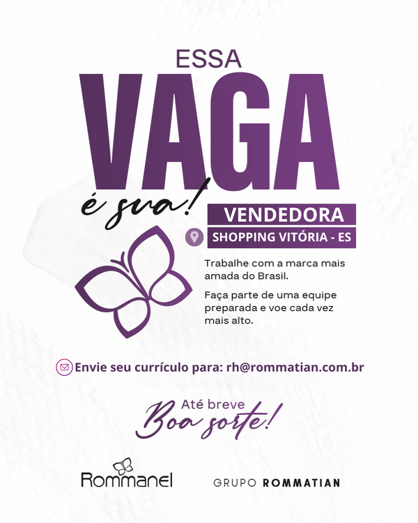 A Rommanel foi eleita a empresa mais admirada do varejo brasileiro no segmento de joias e bijuterias pelo ranking IBEVAR/FIA. Nosso ambiente é dinâmico, com desafios e muita oportunidade para se desenvolver e crescer profissionalmente. Se você se considera uma pessoa com energia, resiliente, gosta de atuar com pessoas e é movida por resultados, seu lugar é aqui!